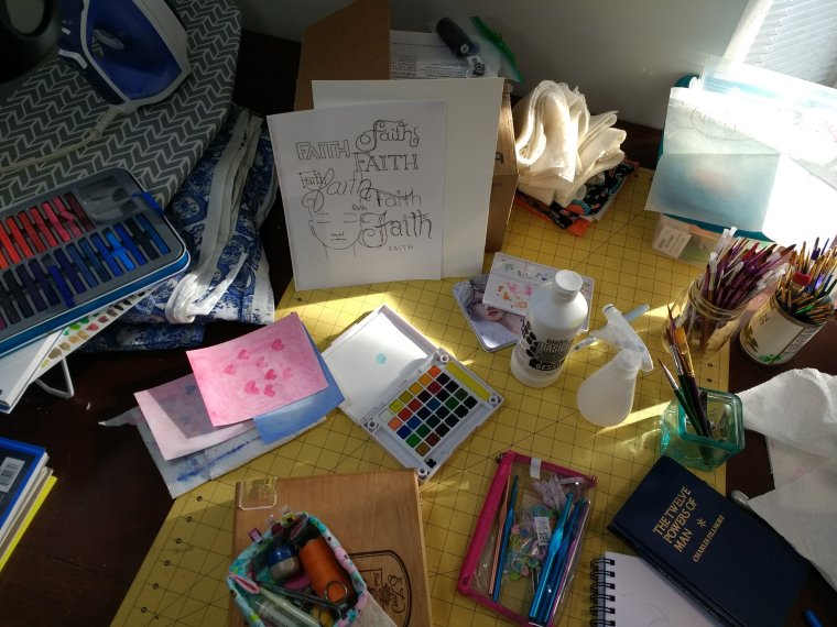 The table has another job now, too. I decided to get serious with some creative ideas that have been floating around for way too long. I’ve got a graphic tablet I set up and then put the laptop on the mini ironing board. I am learning how to use the tablet along with a graphic program. I used to LOVE creating things in old computer card programs, like printmaster, and it fits with my background training in Commercial Art, which is outdated today. I reminded myself of that when I was caught in the fear of taking on something I perceived as difficult for my computer skills and my age. It was like a mini light bulb that I would simply be adding to what I already know and got out of the negative, down-playing trap. (Think there is a talk or class in there.) We’ll see where this goes! Some times I have to rein in the wonderful ideas and select what I think would actually be helpful or beneficial. But, this is where I am now.