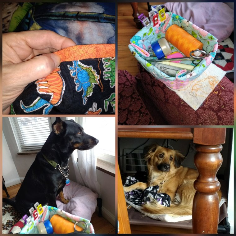 I love organizing tools. Some work, some don’t, but these can covers seem to be helping! The pattern was surprisingly easy and I like the result. I’ve kept some little, often used tools on the table by my chair in the fabric bins I made before, but the can cover let’s me keep more handy and easily accessible and even neater. Guess you can tell which sits on the sewing table. Don’t want much on the table since it serves in so many ways, but we will see if this becomes a help or hindrance. It has lightened the load of what is in the drawers under the machine, since I put the marking tools in it, some sticky notes, the tape measure and such. Love having the extra pin cushion too and it has been helping. – It was make that or develop a new habit of moving the thing when I went from pinning to machine. Such a tiny annoyance, so easily solved.