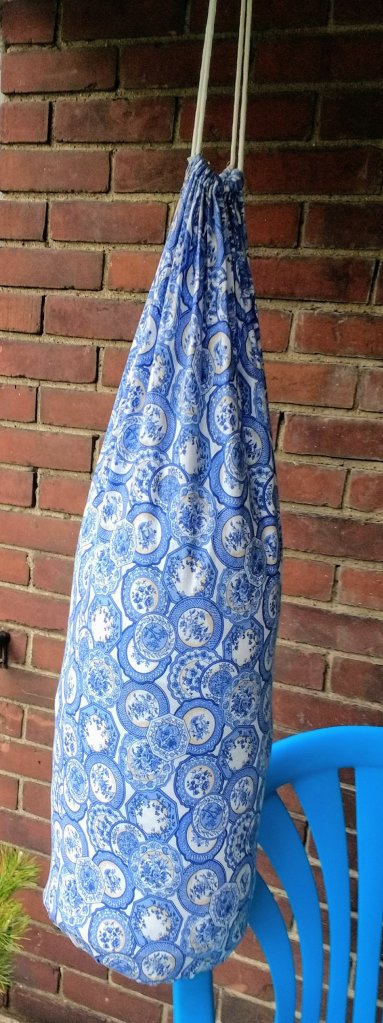 I had saved plastic shopping bags that I planned on making into “plarn” to use to crochet shopping totes, but they were perfect for the stuffing in this! They pack enough for her to feel the hits, but still have give! We stuffed it to the top, pulled the drawstrings and hung it up where we had yoga trapeze silks hanging in the basement (good place to swing, or get some physical activity in during the long winter). She has a interlocking play mat under it, almost like her own little gym. Sidenote – the trapeze was great til she maybe fractured her arm and was in a cast a few weeks. I was a bit nervous after that. And, the basement environment here does not improve.